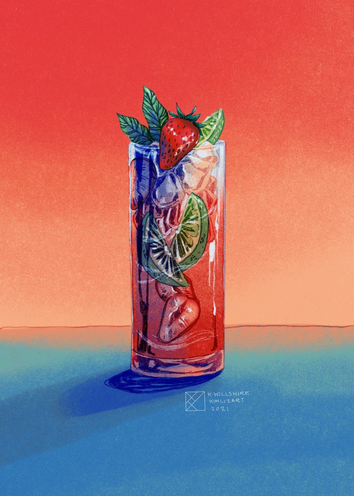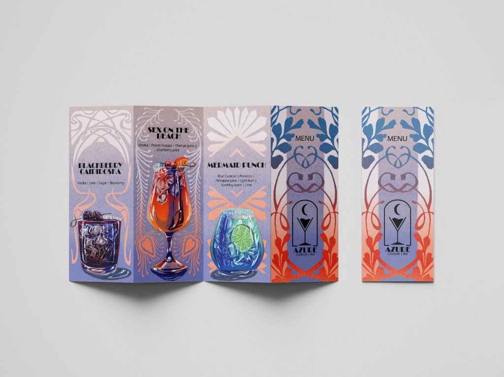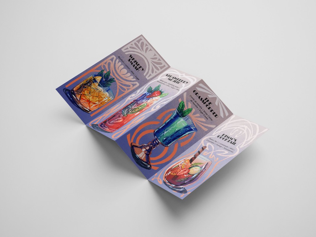 This personal project started after I created a series of cocktail illustrations. I was heavily influenced by Art Deco and Art Nouveau for the boarders and embellishments to the final product. My goal was to make it look cohesive.